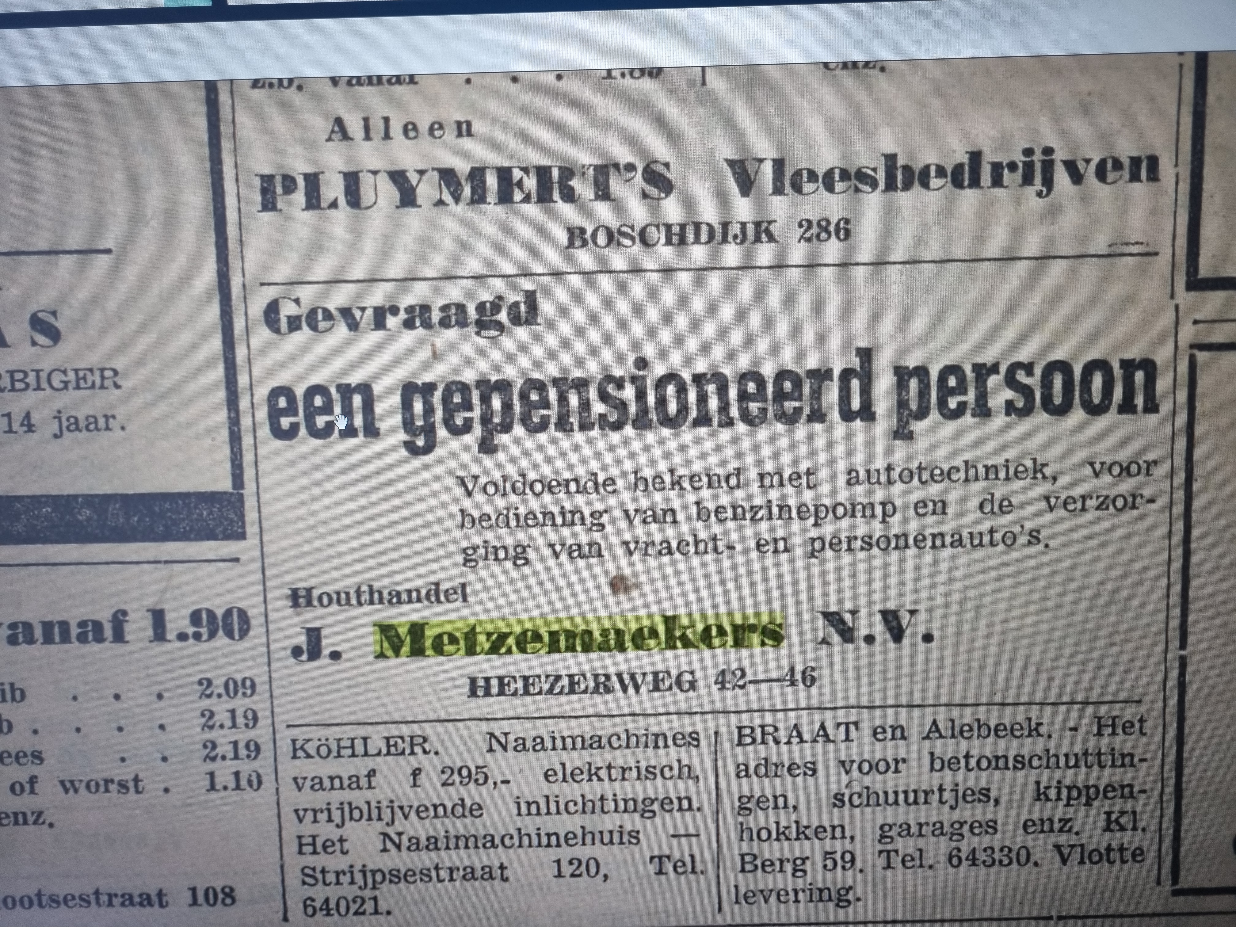 | Beschrijving | De houtopslag en kantine van N.V. Metzemaekers aan de Heezerweg, oktober 1956. Deze houtwerf was dicht bij de Sint Joriskerk. Het bedrijf was gevestigd op de huisnummers 42-46. De houthandel is later vertrokken en naar de gemeente Best verhuisd. Het bedrijf werd begin jaren dertig opgericht. Mijn opa was tot die tijd werkzaam bij de Picus, maar door de crisis verloor hij daar zijn baan. De familie Metzemaekers was in die tijd ook woonachtig in de wijk Stratum. KLIK HIER voor enkele extra foto's. Het adres blijkt ook uit een advertentie die de bijdrager later instuurde (klik HIER). (Red.) |