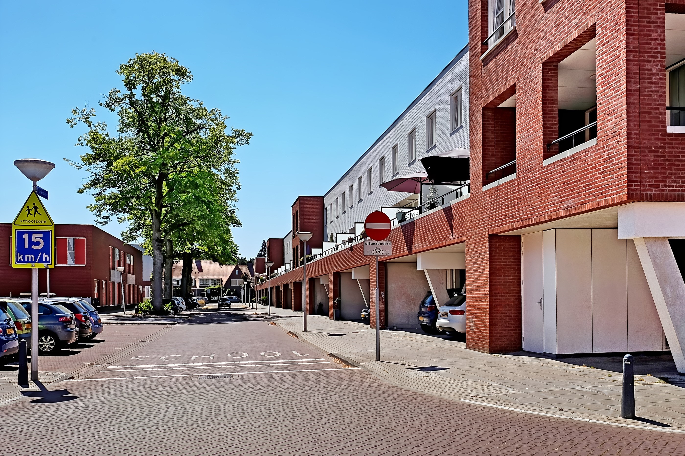 De Telexweg, gezien vanaf de Hofstraat. Beide straten zijn in 2025 opnieuw ingericht, waarbij de rijbaan is versmald en er meer groen is gekomen.