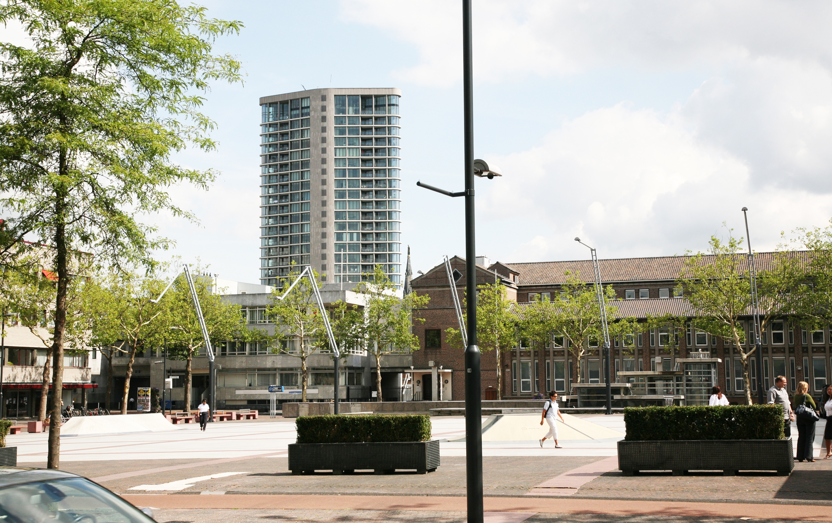 Het Stadhuisplein met op de achtergrond de Vestedatoren. Op het Stadhuisplein zijn nu dikwijl veel jongeren actief op boards en skates. Het plein en de omgeving worden de komende jaren ontwikkeld tot [meer]