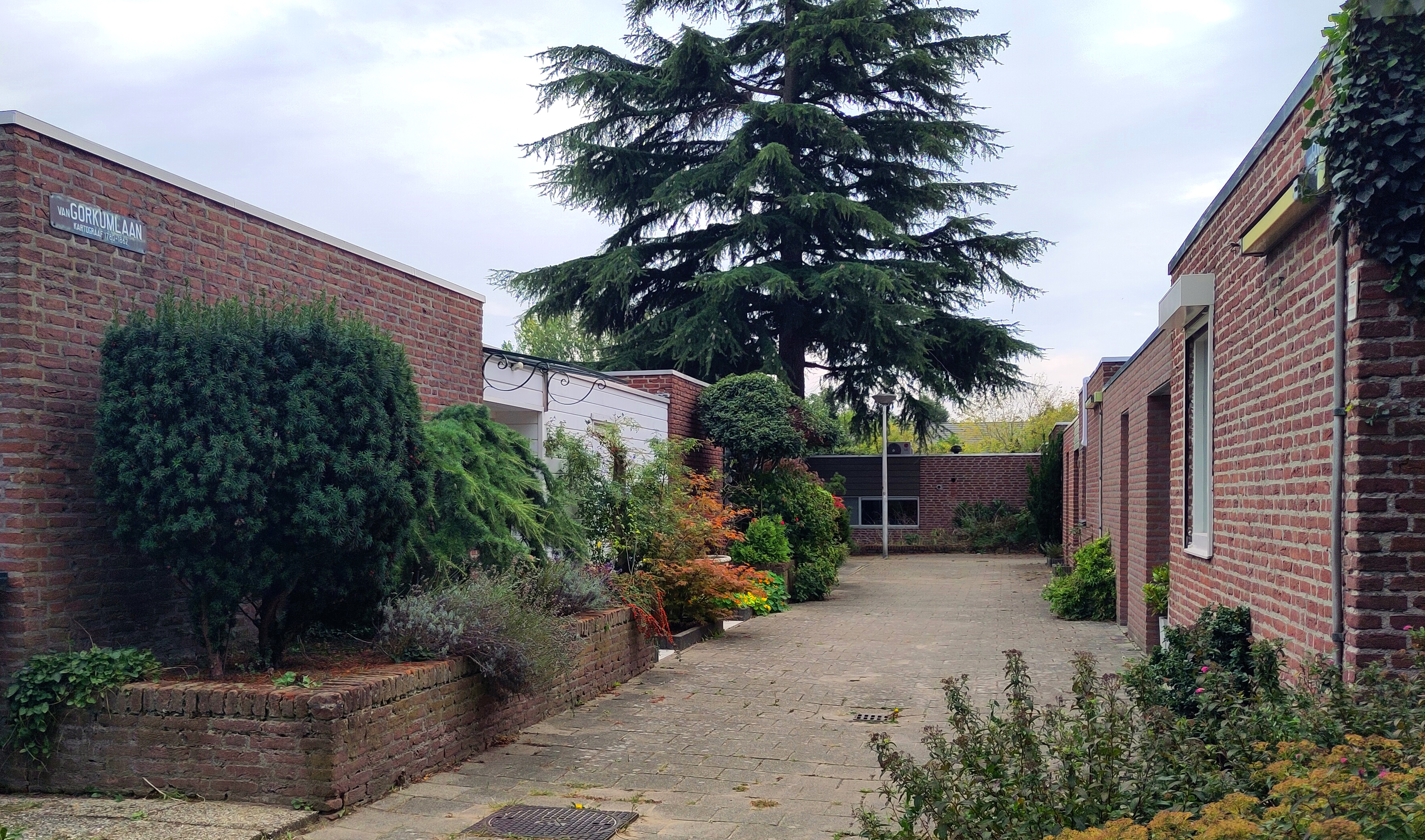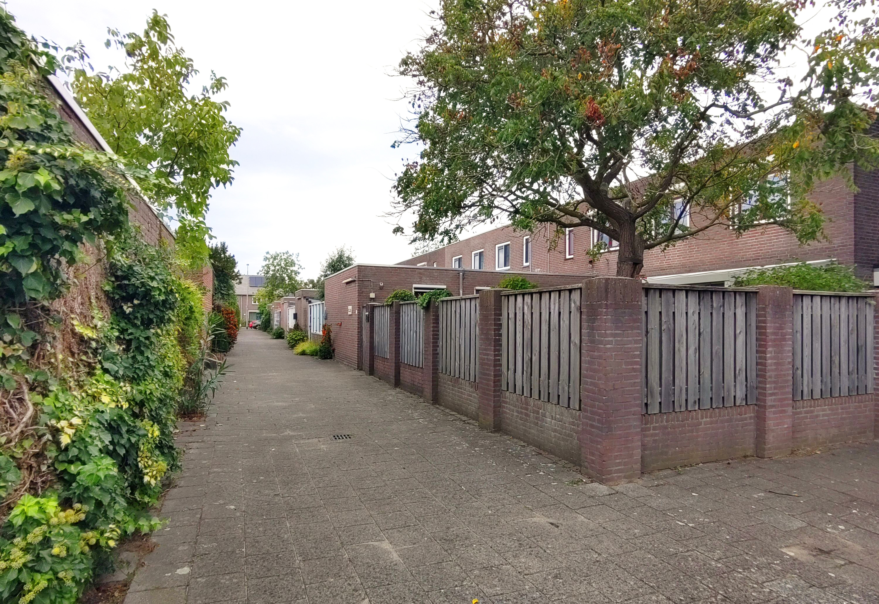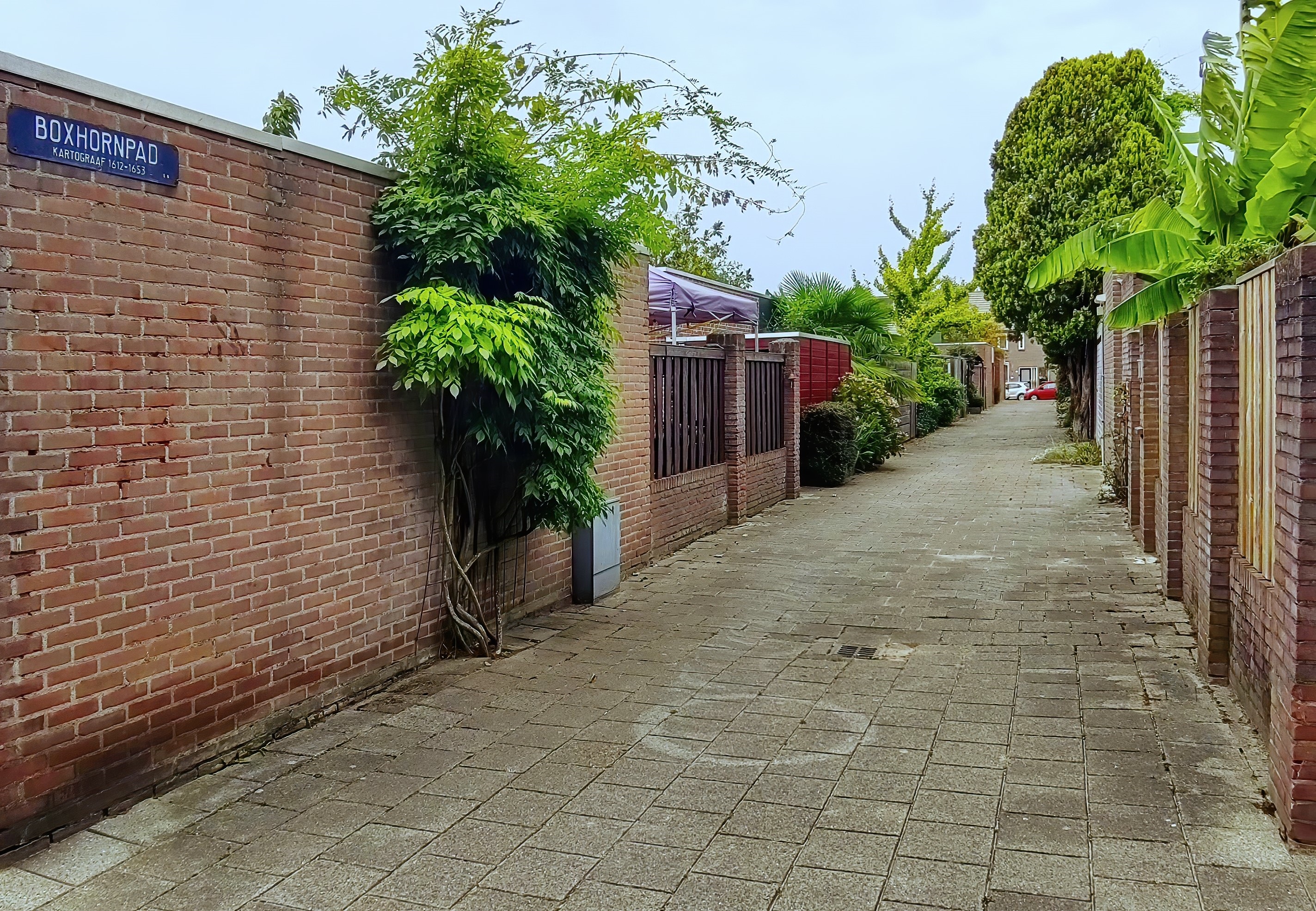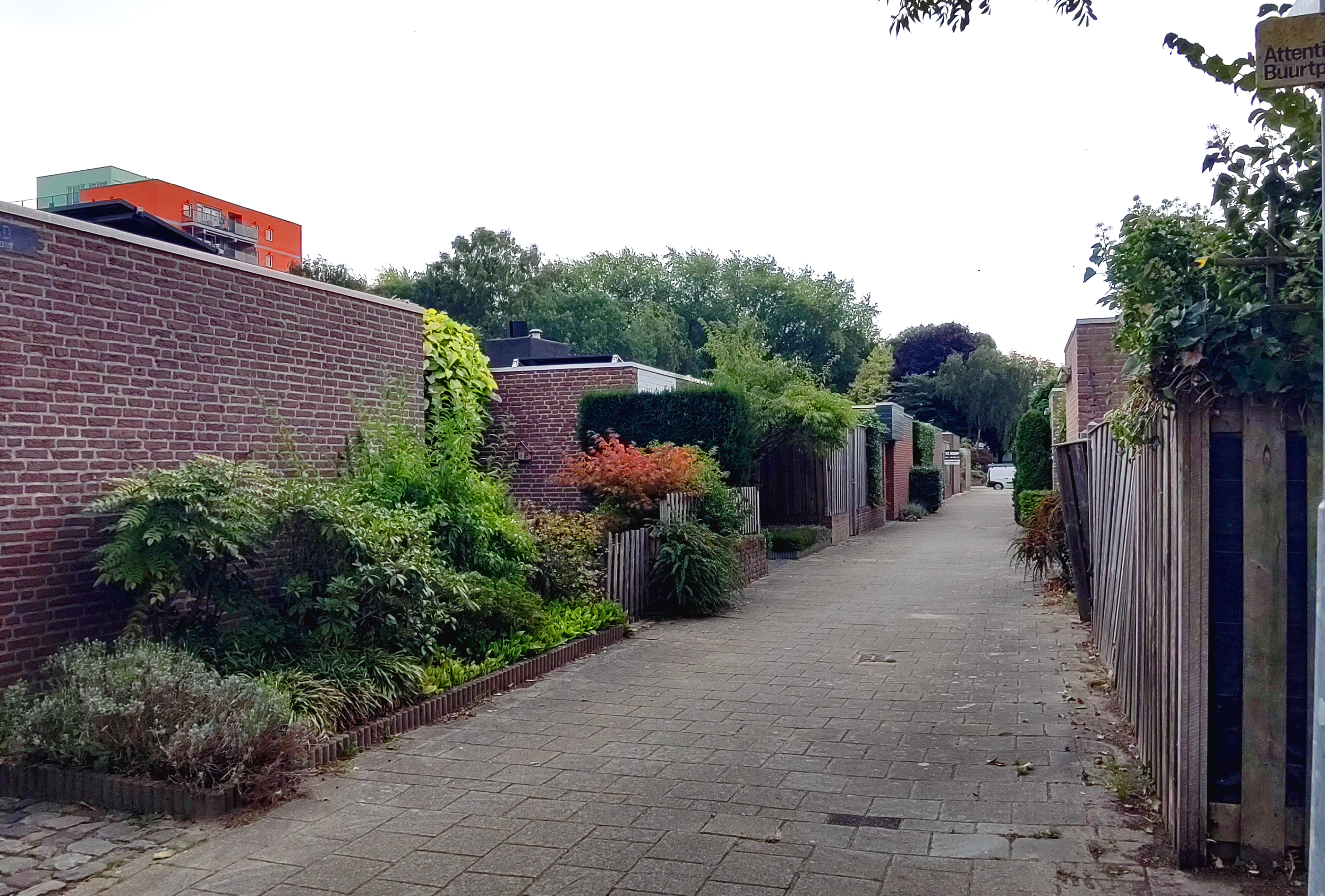 Het Boxhornpad vanaf de Mortierlaan. Op het eerste oog lijkt dit een pad langs de achterkant van huizen, maar dit pad loopt langs de voorkanten van de woningen. (Red.)