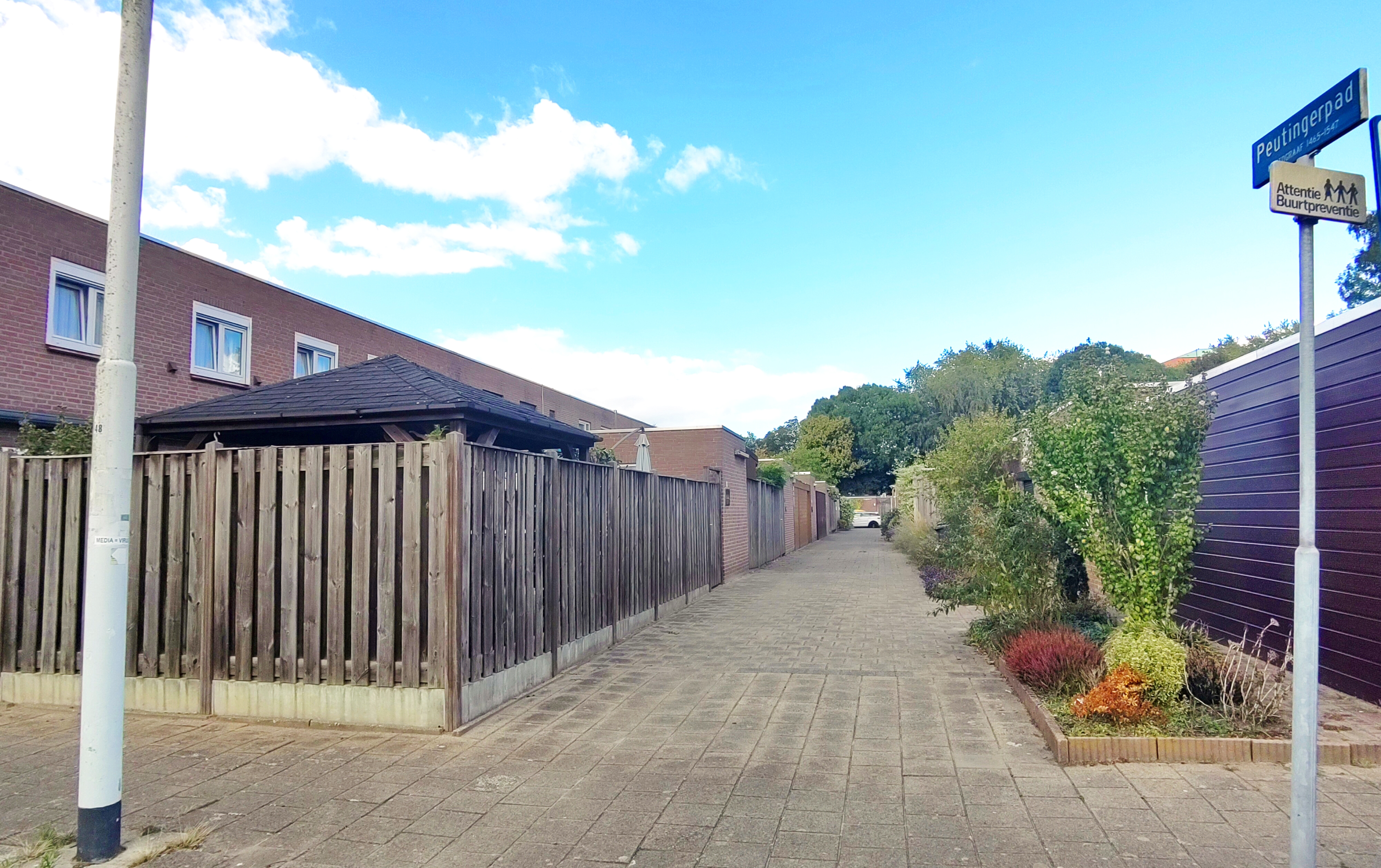 Zicht op het Peutingerpad, vanaf de Kaartmakersring. Aan weerskanten van dit pad liggen de voorkanten van de huizen. (Red.)