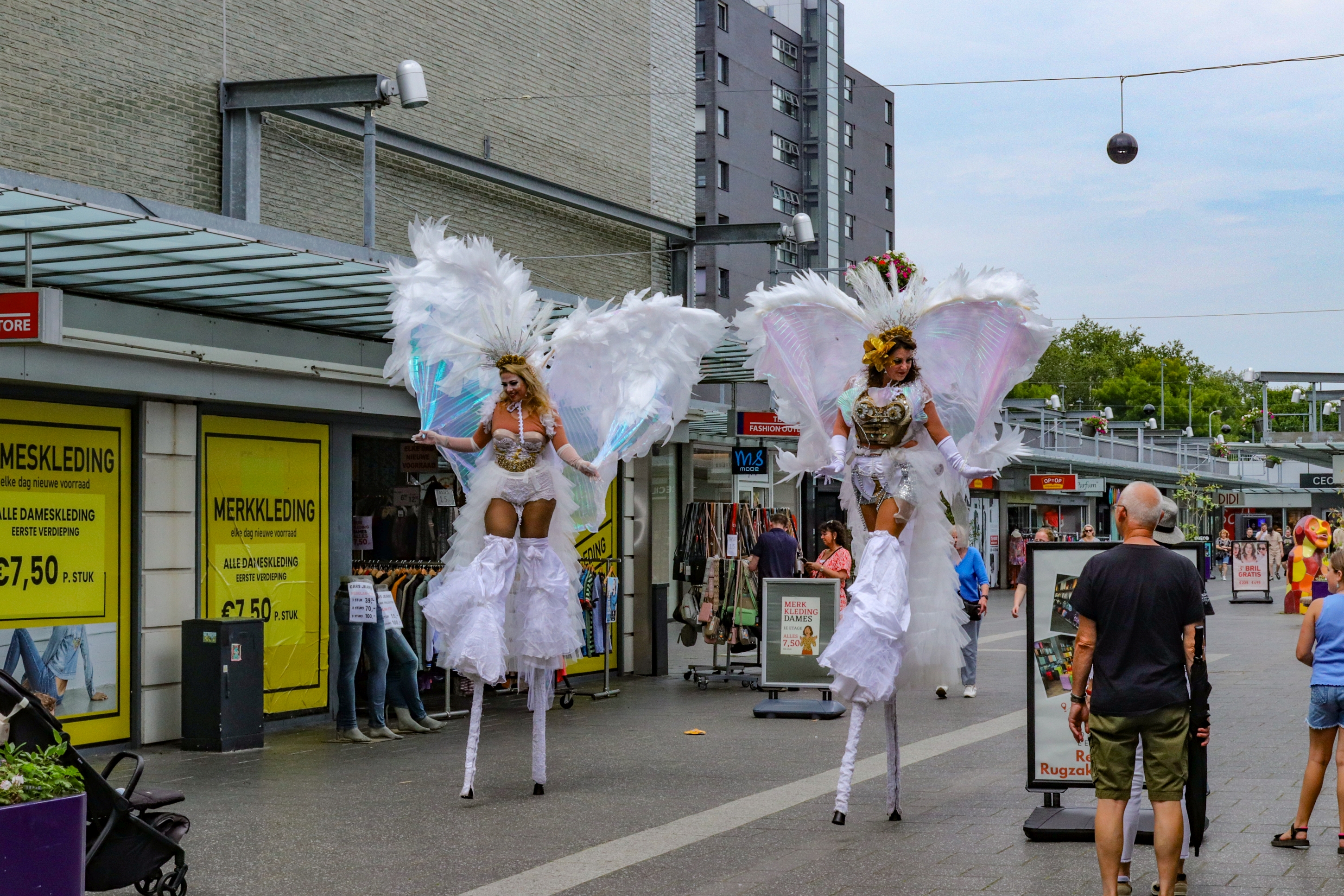 Deze 'witte dames' balanceerden op tweede paasdag, 14 juni, door het Winkelcentrum Woensel. Daar zijn vaker zulke artiesten en standbeelden te bekijken. Zie bijvoorbeeld de foto's #56274, [meer]