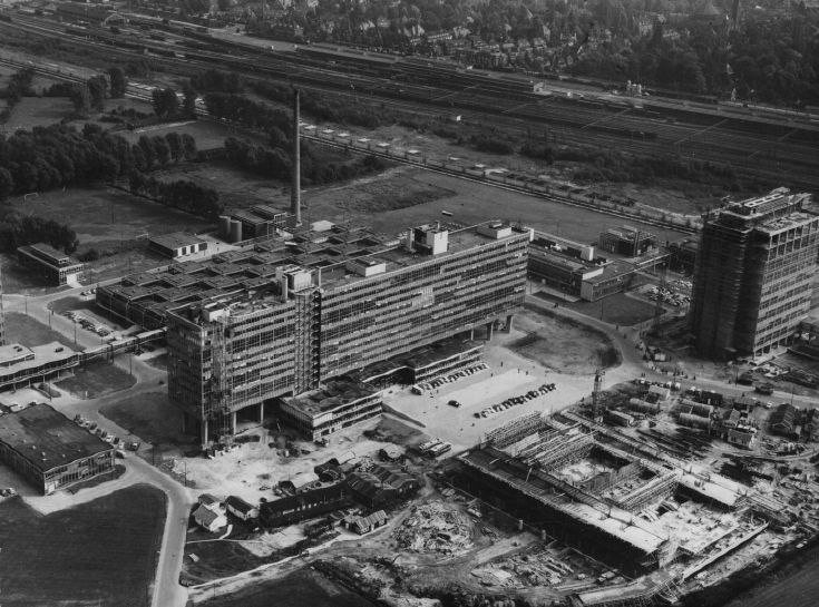 Deze foto toont het bouwen van het hoofdgebouw van de Technische Hogeschool (nu TU/e), in de fase eind 1963. De foto is afkomstig van KLM Aerocarto.