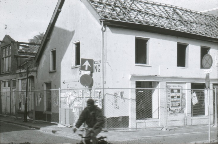 De sloop van het Gordijnenhuis St. Jan op de hoek Grote Berg (rechts) nummer 20 en de Bergstraat (links). Zie ook foto's #38653 en #12798. Vóór die tijd zat hier hotel/caf&eacut[meer]