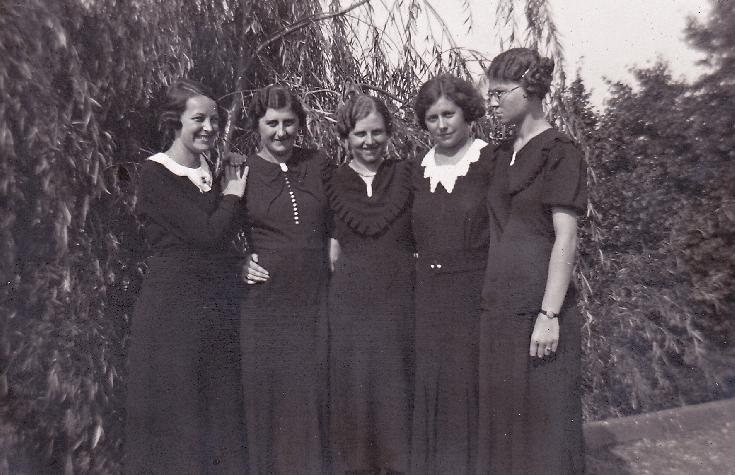Op de foto staan 5 dames maar er stonden 6 namen bij: Jo van Duren, Bets Straatman, Leni Mathijsen, Annie Dujardin, Marietje Laman en Mientje Klomp. De laatste is mijn moeder, ze staat uiterst rechts. [meer]