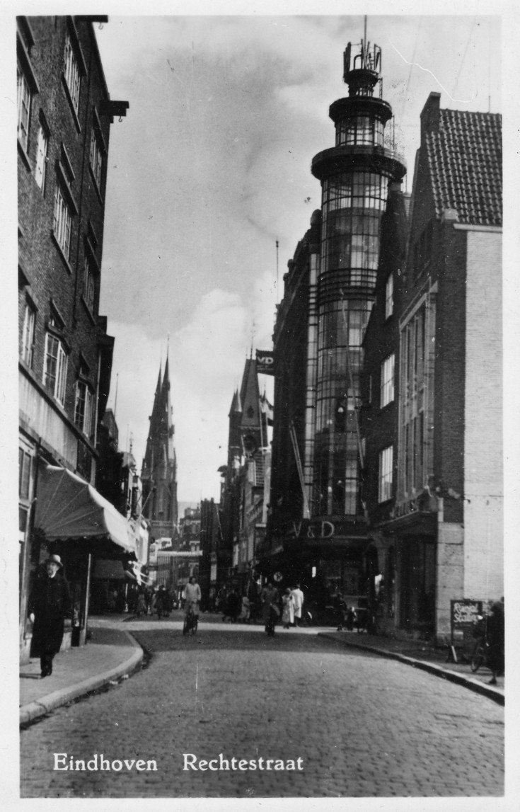 "Het enorme nieuwe pand der firma Vroom & Dreesmann is gereed. Een foto van den voorgevel in de Rechtestraat. Het gebouw is wel geheel in de stijl van den nieuwen tijd." Uit de Eindhove [meer]
