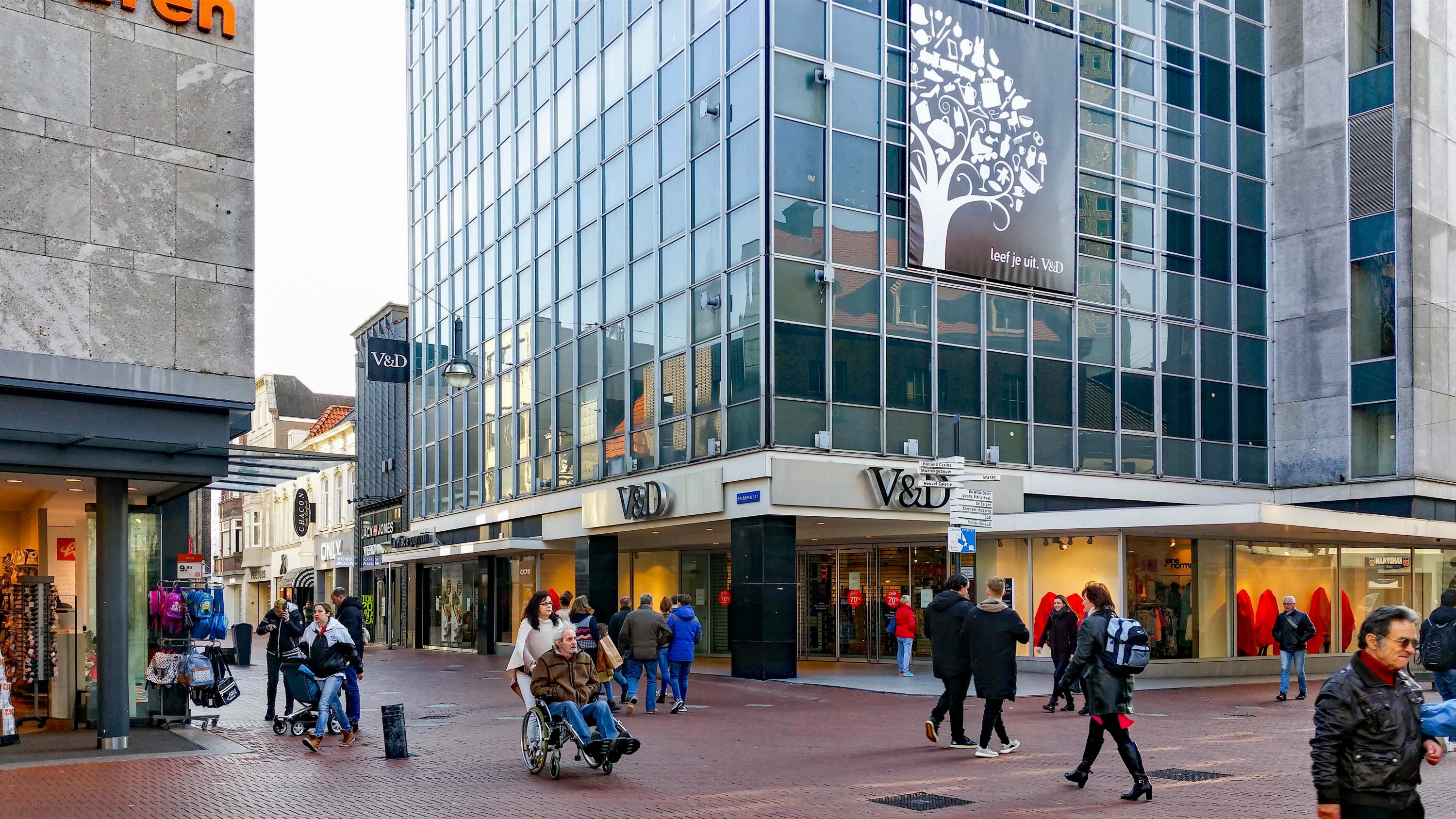 Op deze foto van januari 2020 is het pand van het failliete warenhuis V&D nog bijna onaangetast, hoewel het V&D-logo al weg is. Rechts staan op de Demer tot aan de hoek met de Vrijstraat (rech [meer]