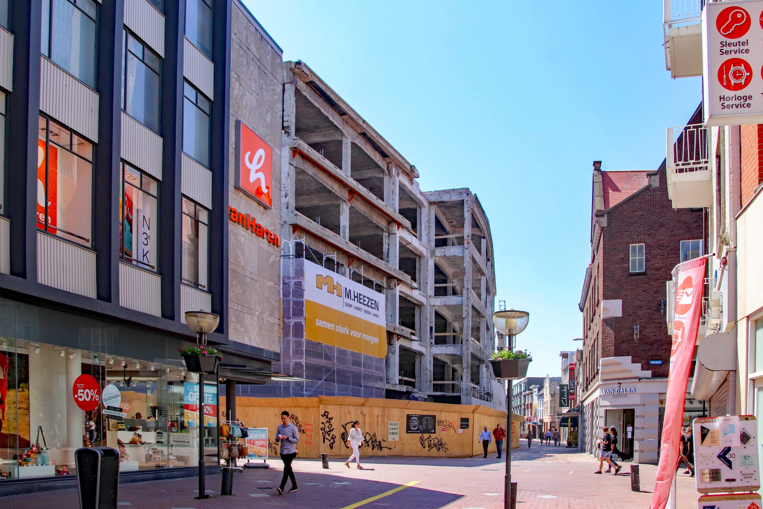 De foto is gemaakt vanuit de Marktstraat op het kruispunt Demer, Vrijstraat en Rechtestraat. Het karkas van dit deel van het voormalige V&D-gebouw blijft staan en zal worden verbouwd tot een appar [meer]