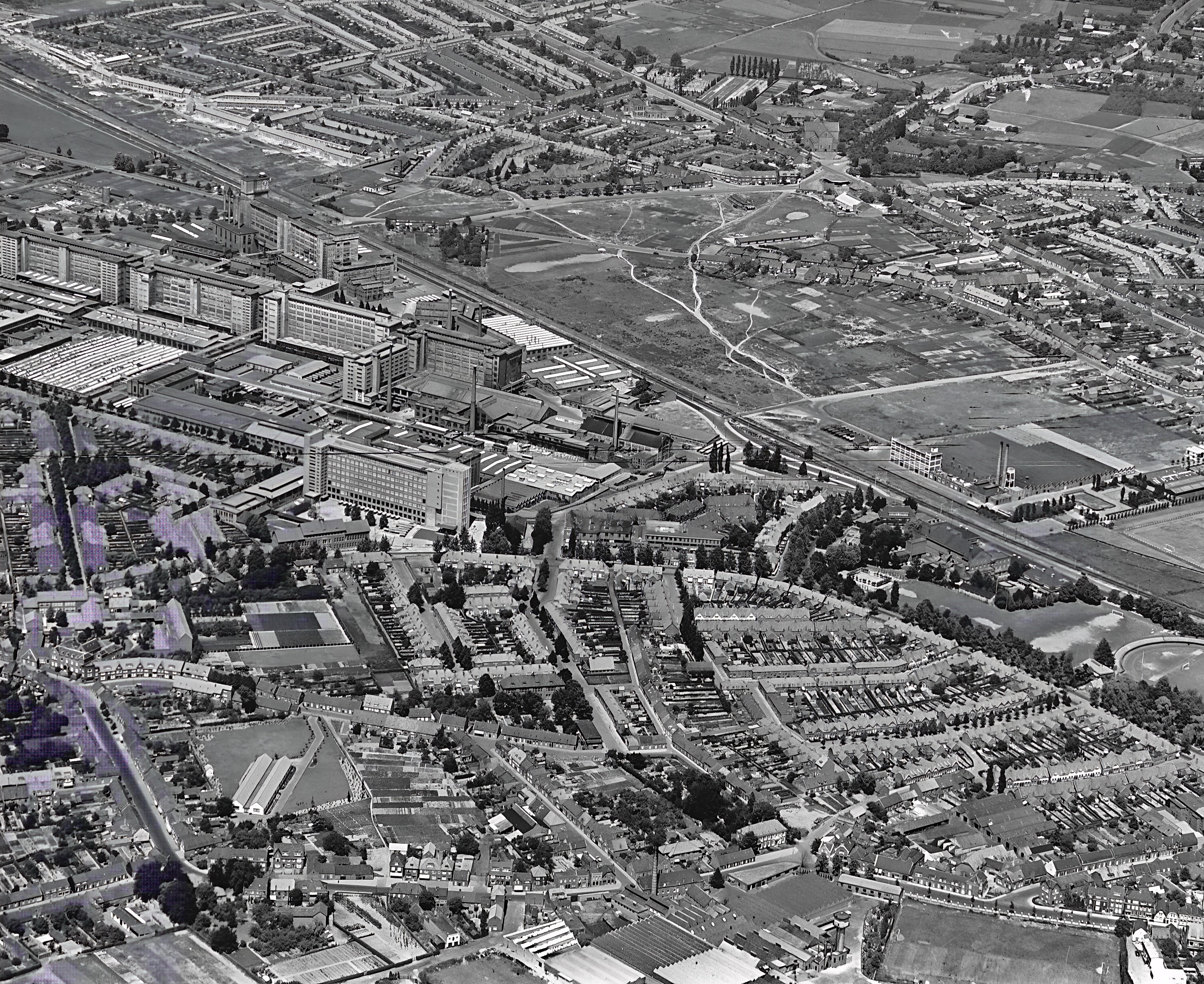 15038Het witte gebouw boven de schoorsteen is De Gruyter, de laatste winkel aan de Fellenoord. Rechts de [meer]