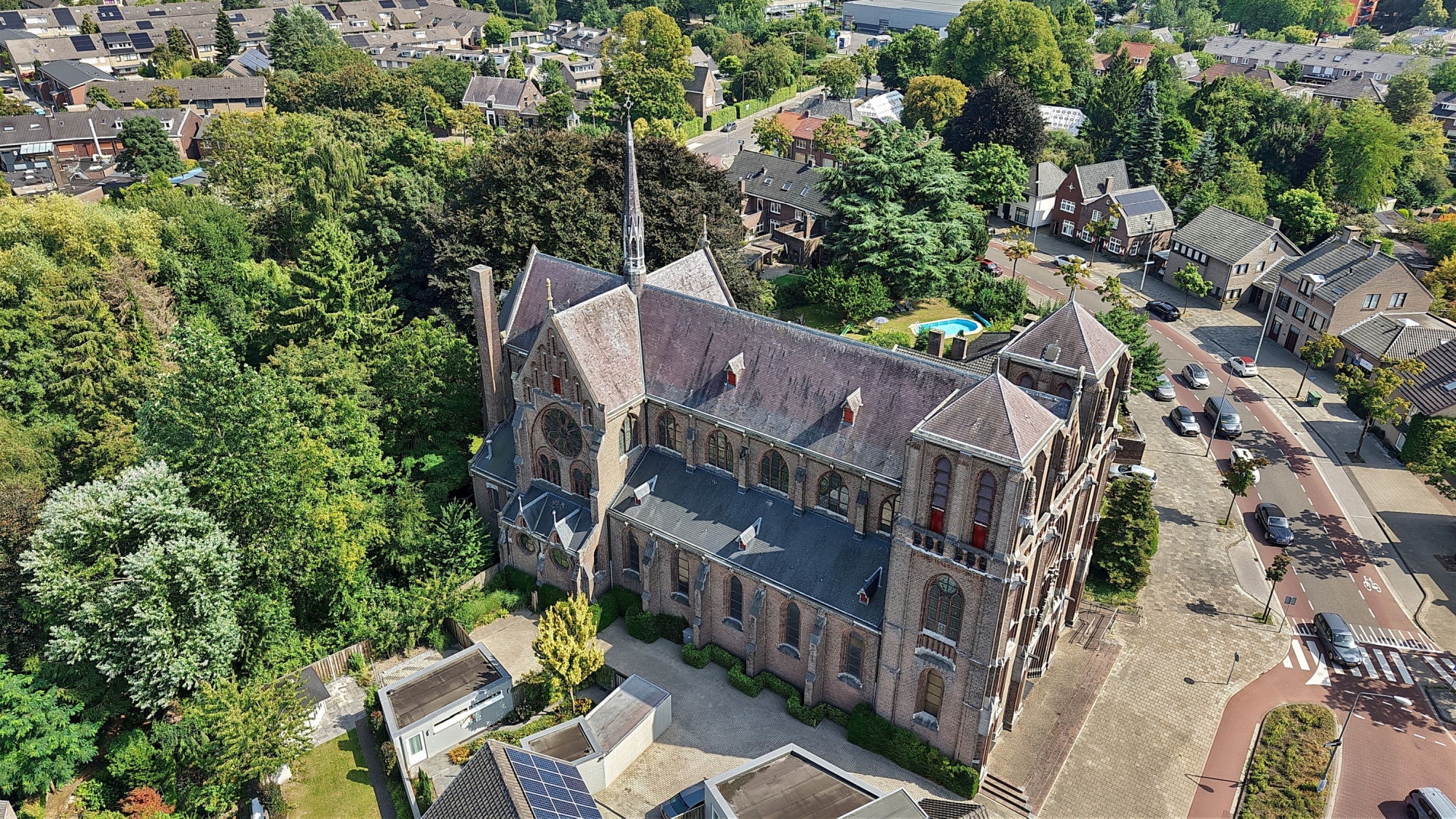 Een luchtopname van de zijkant van de St. Martinuskerk aan 't Hofke. Zie ook o.a. foto's #52958, #19697 en #19698. (Red.)