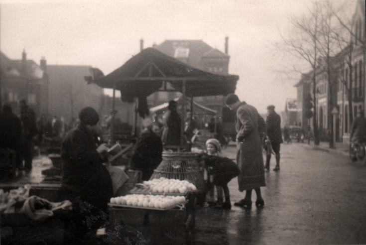 De vrijdagsmarkt op het Wilhelminaplein. Rechts achter gaan we de Julianastraat in.