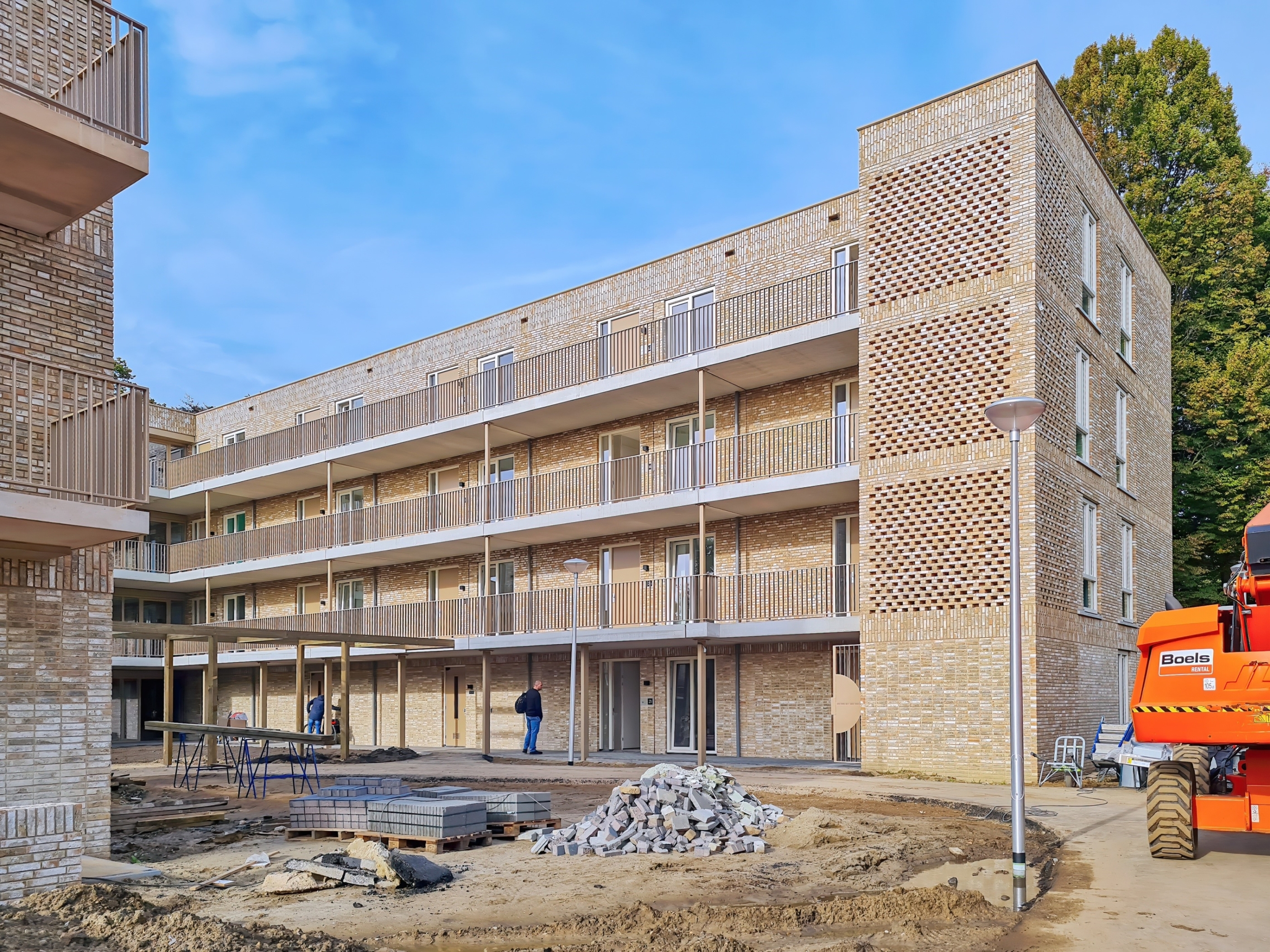 In november 2023 namen de eerste flatbewoners op de Elsthof in Eindhoven hun intrek. De publieke buitenruimte was nog in ontwikkeling. Zie ook foto #56370. (Red.)