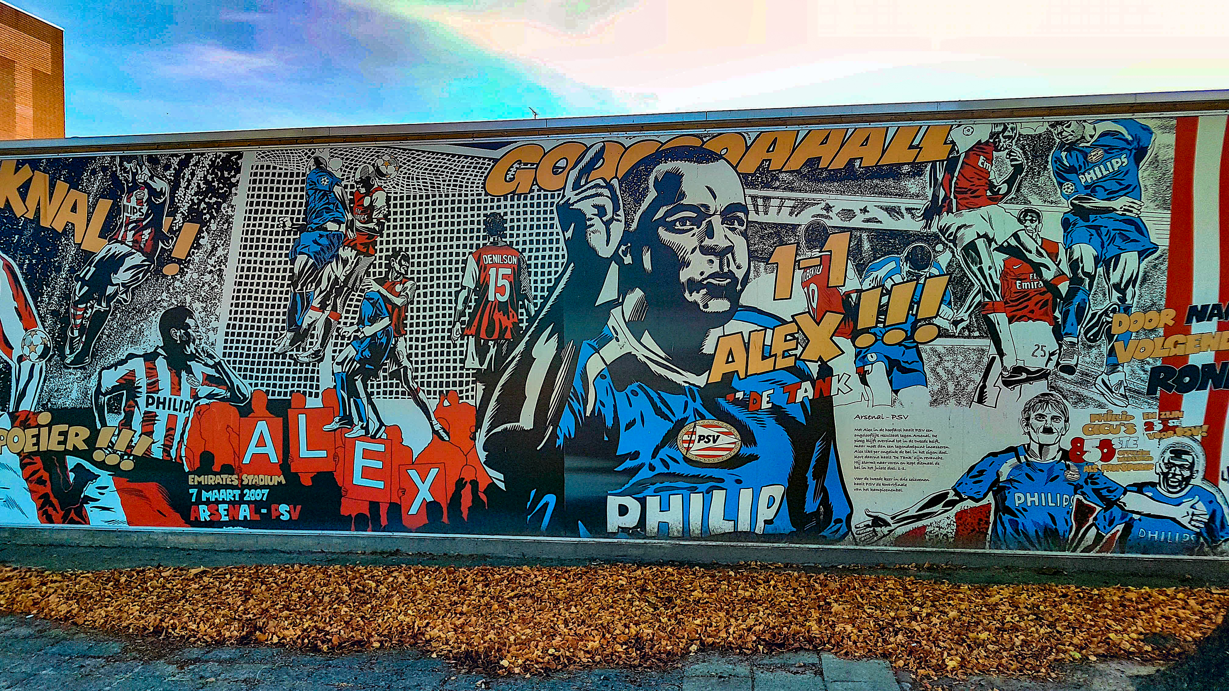 Graffiti in de Wijnpeerstraat bij de bocht naar de Sonseweg. De tekening toont enkele bekende namen van PSV, zoals de Braziliaanse verdediger Alex, ofwel "de tank" en rechts spelbepaler [meer]