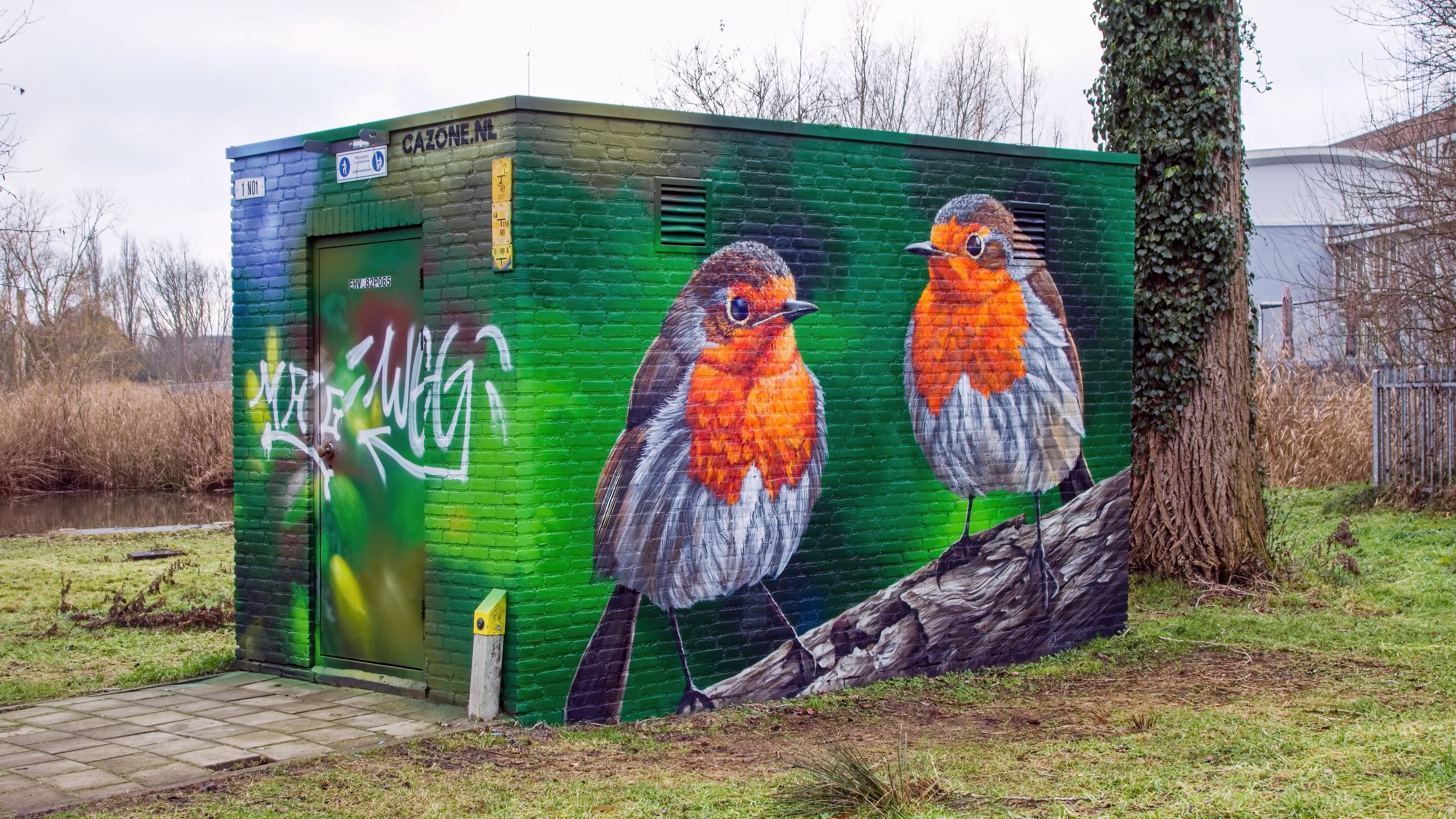 Deze street art in het Genderpark is met toestemming gemaakt door Cazone, die in Eindhoven al geruime tijd graffitikunst maakt. Ook deze uit de kluiten gewassen roodborstjes zijn van zijn hand. Zie oo [meer]