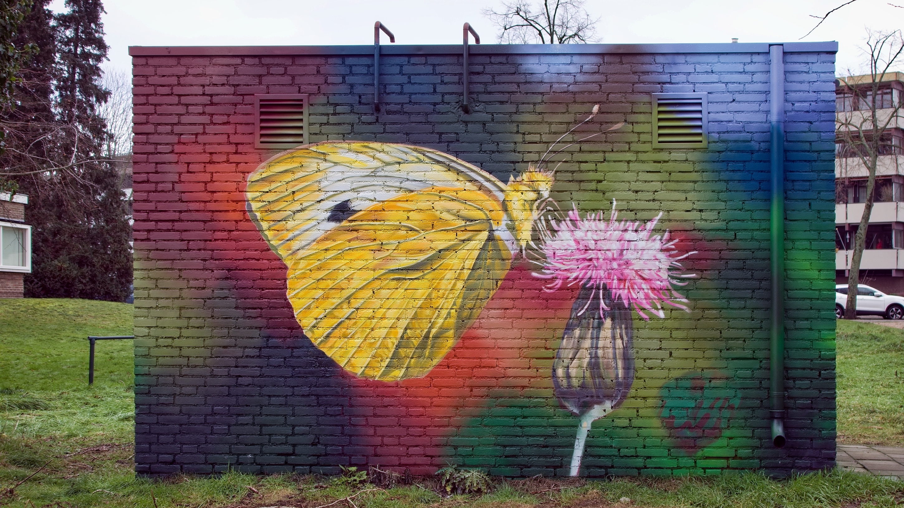 Deze street art met de vlinder is met toestemming gemaakt door Cazone, een artiest die al langer in de stad plekken mag verfraaien, zoals hier in het Genderpark. Op dit gebouwtje staan meer versiering [meer]