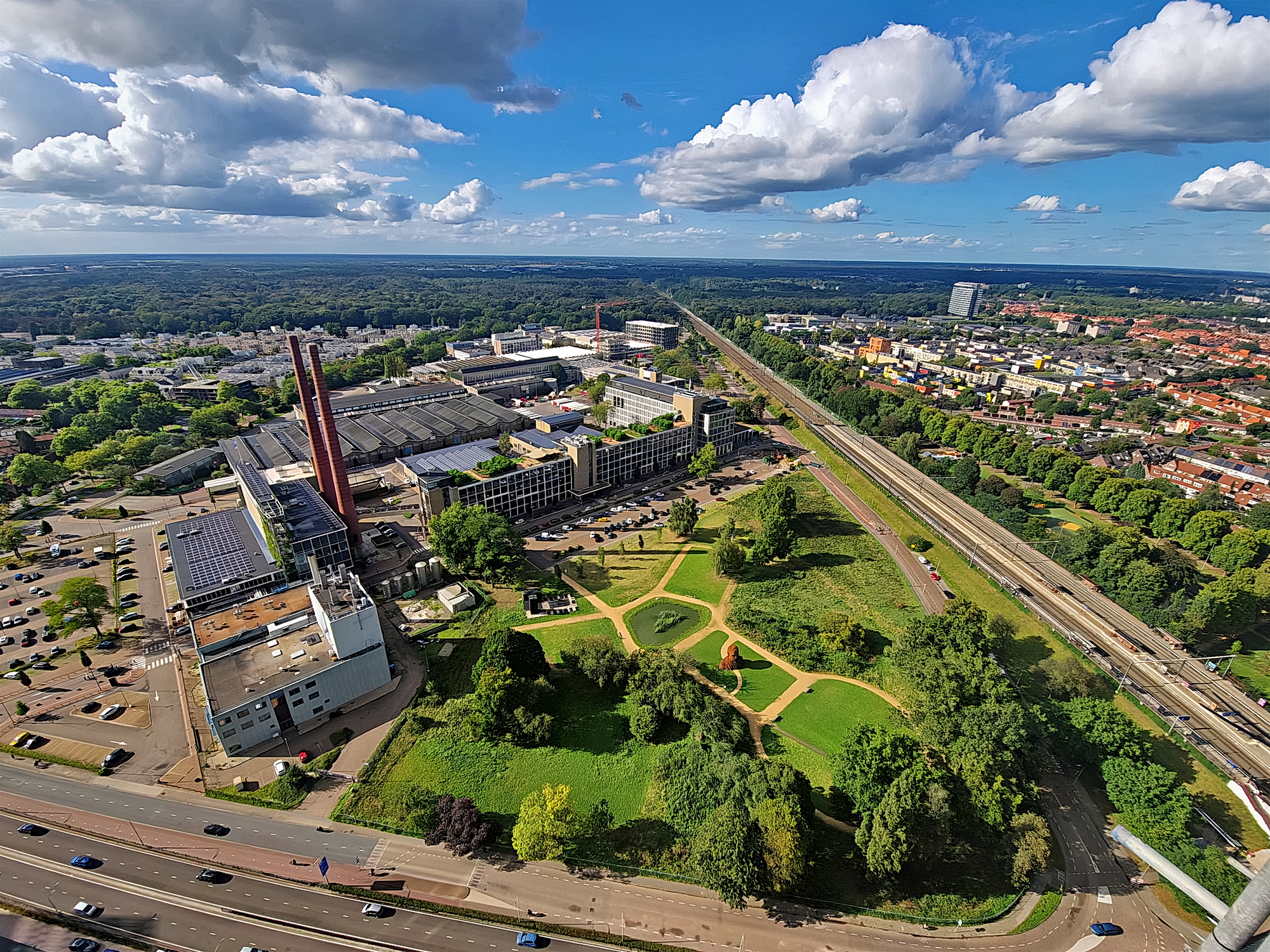 Woensel-West gezien vanaf de woontoren Lighthouse op Strijp-T. Op de voorgrond de spoorlijn en eronder de Achtseweg-Zuid. Iets links van het midden de vooralsnog enige hoogbouw in Woensel-West, het vr [meer]