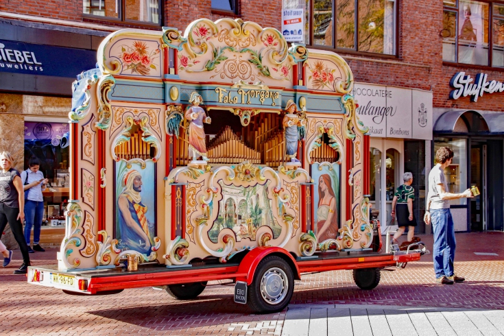 Het kleurige draaiorgel Fata Morgana in oktober 2018 op de hoek van de Markt en de Hermanus Boexstraat. Op de achtergrond de bekende juwelier Siebel, chocolaterie Boulanger en de bekende brillenwinkel [meer]