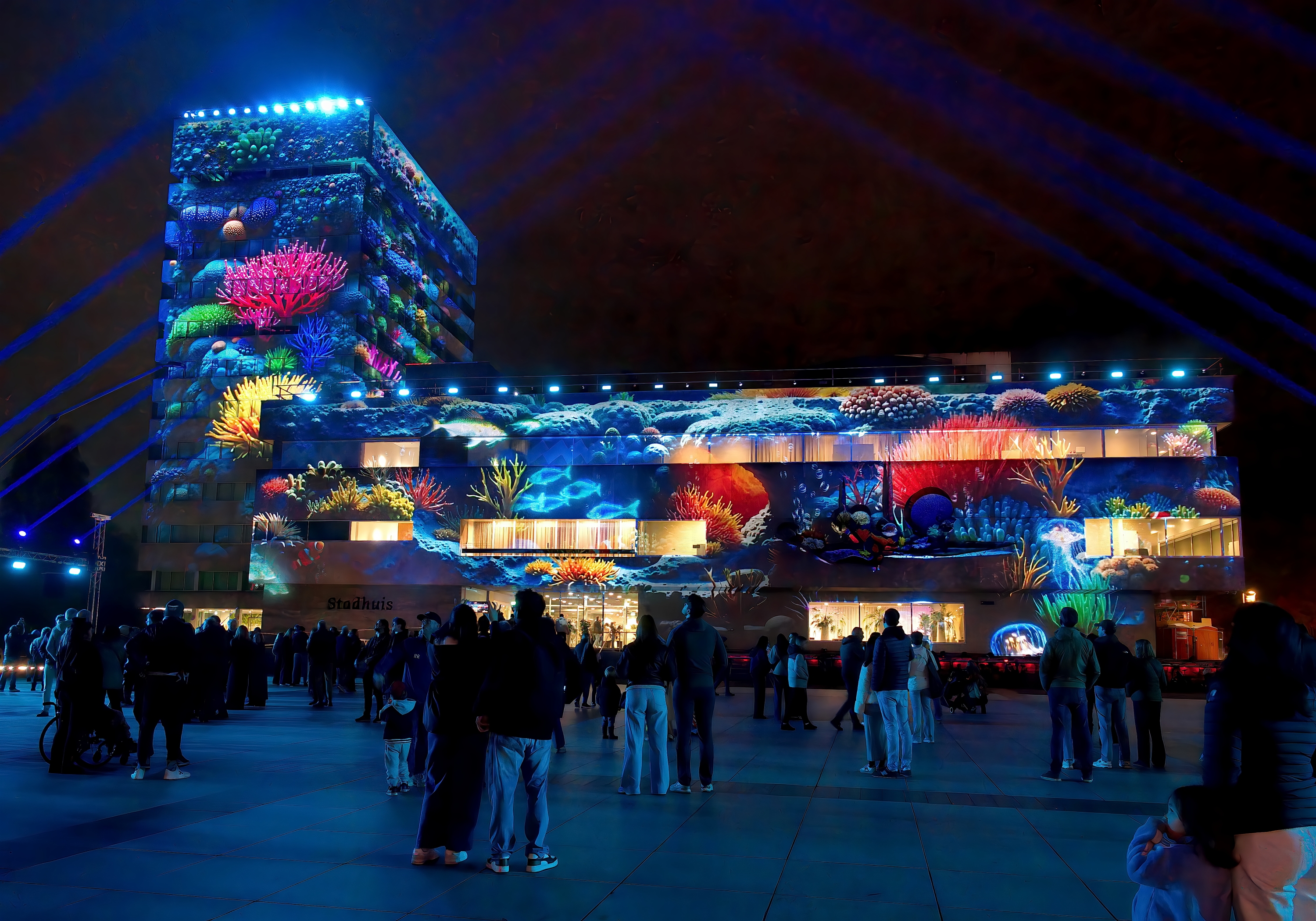 De lichtshow vanaf en op het stadhuis tijdens Glow op het Stadhuisplein. (Red.)