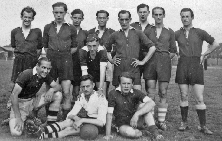 Voetbalelftal Mignot & De Block PMB aug. 1947. Vooraan: Ad Schellekens, Sjeng Fransen, ?. Daarachter v.d.Nieuwenhof en Jan Verhoeven. Achterste rij: v.d.Put, ?, ?, Toon Nuchelmans, Loet van Beek, [meer]
