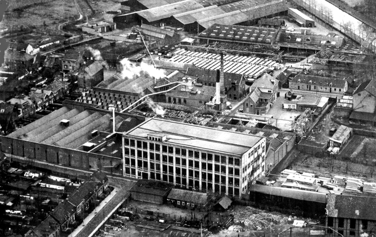 Een overzicht, genomen vanaf het kantoorgebouw (vier etages, blokvormig gebouw, zie foto #917). Rechts zien we de kantoorvilla aan de Tongelresestraat, die nu nog over is. Daarachter het terrein Picus [meer]