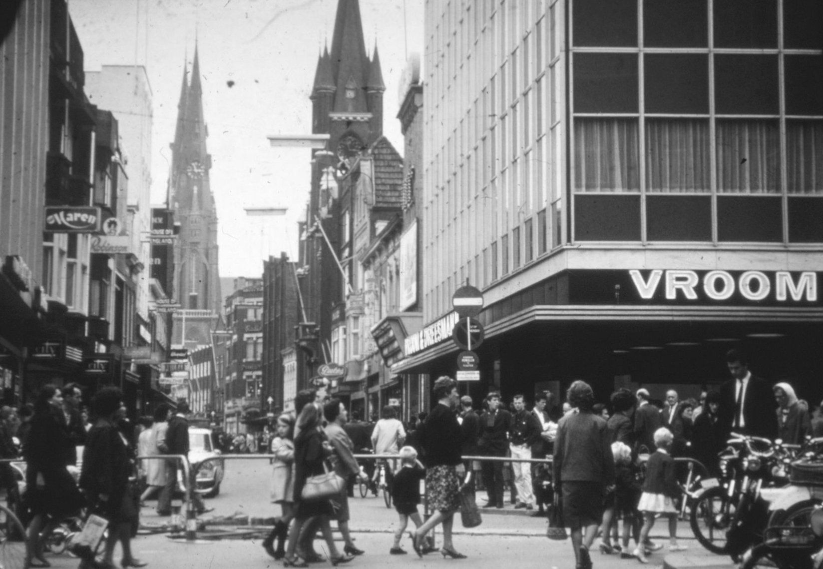 We kijken vanuit de Demer naar de kruising met de Rechtestraat, Marktstraat en Vrijstraat, waar de glazen toren van V&D staat. Links is de Demer nog leeg omdat tijdens het Sinterklaasbombardement [meer]