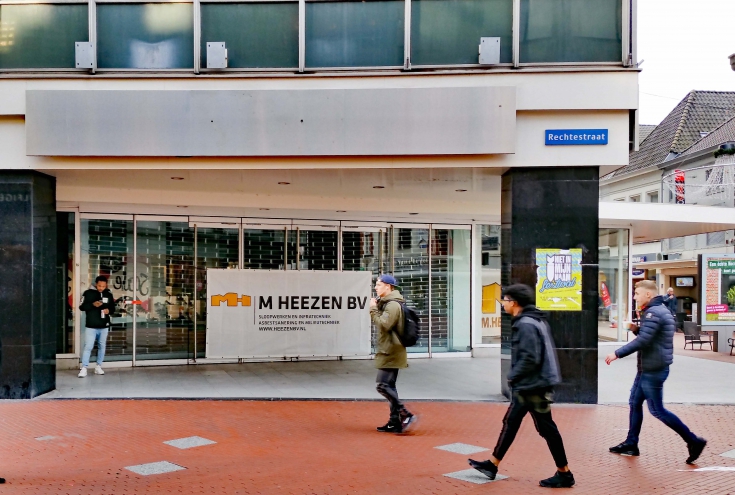 Op deze foto van januari 2020 is het pand van het failliete warenhuis V&D nog bijna onaangetast, hoewel het V&D-logo al weg is. Rechts staan op de Demer tot aan de hoek met de Vrijstraat (rech [meer]