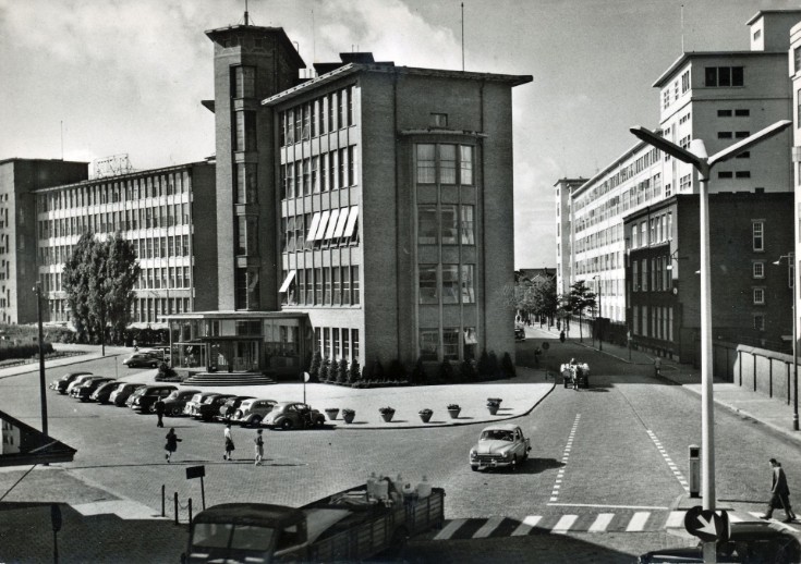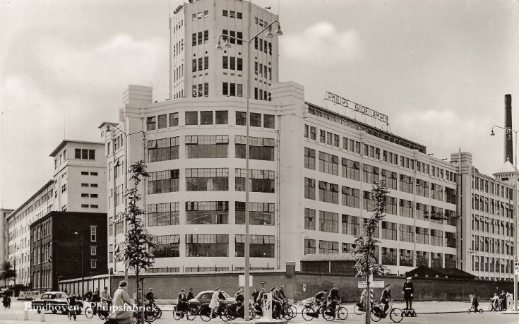 De radiobuizenfabriek aan de Emmasingel. Het gebouw is de voorloper van de huidige Witte Dame. De foto is waarschijnlijk uit begin jaren vijftig. (Red.)