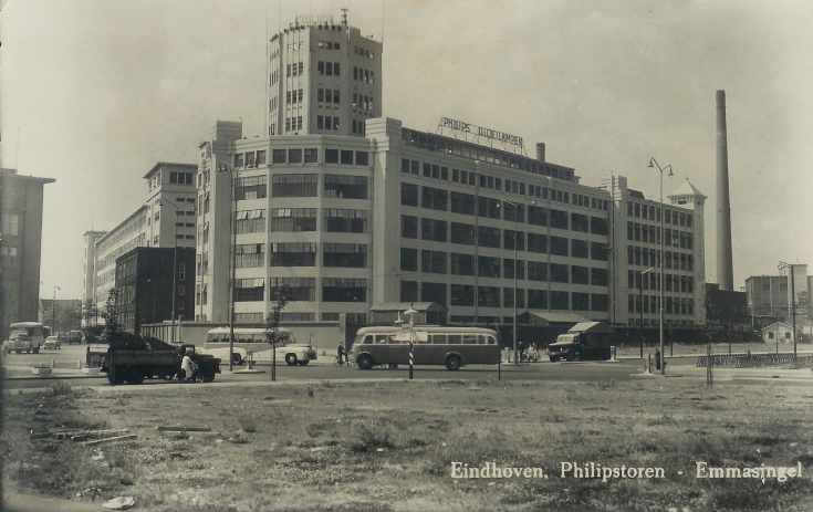 Het Emmasingelcomplex van Philips (complex E) in volle glorie. We zien de Lichttoren, de Witte Dame (die hier al is witgeschilderd), de Bruine Heer aan de overzijde van de Emmasingel, de fabrieken aan [meer]