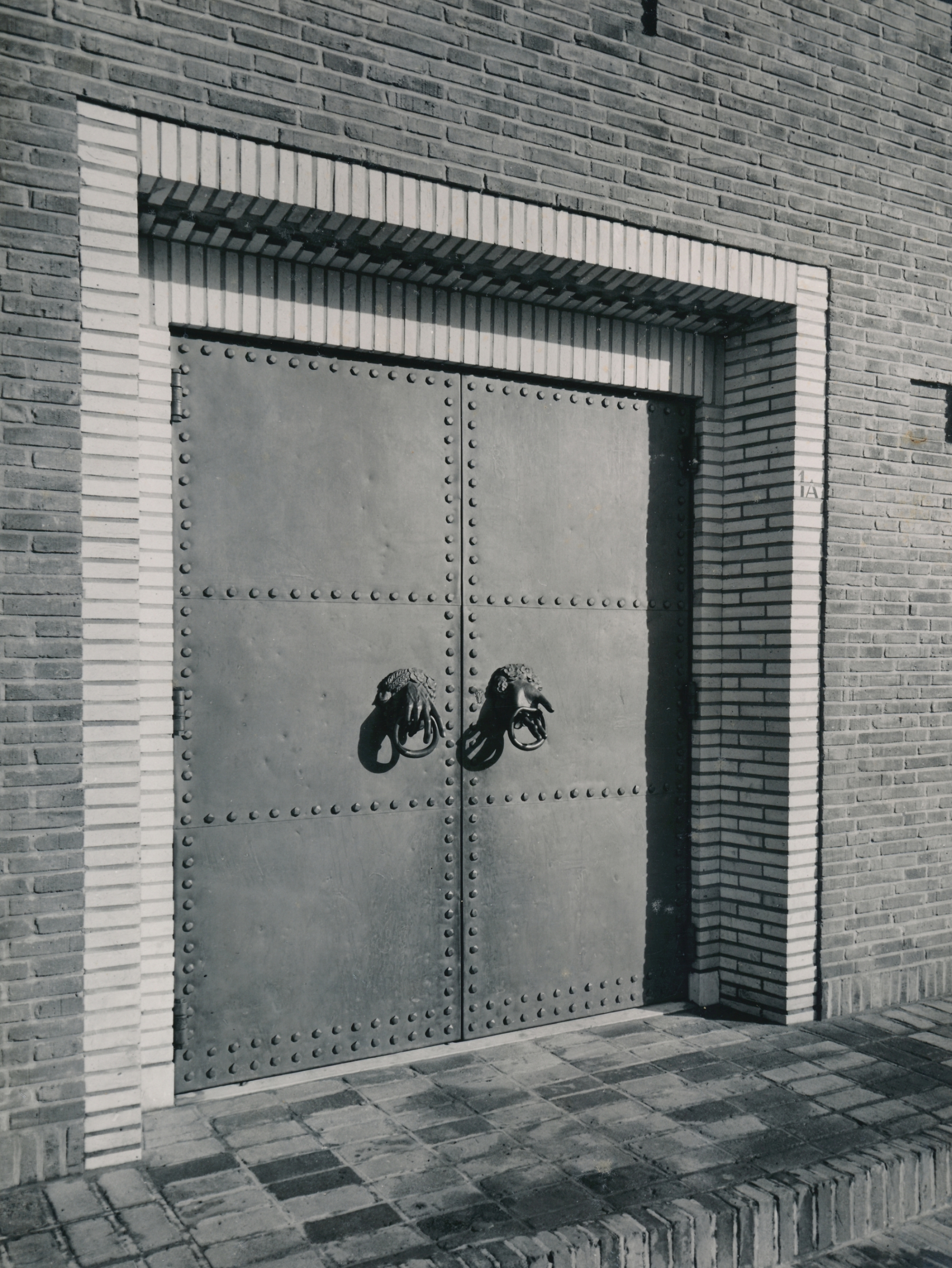 De 'deurklinken' van de hoofdingang van de Remonstrantse kerk aan de Dommelhoefstraat. Zware stalen deuren met deze stevige handgrepen. Zie ook o.. de foto's #21138, #56394, #56395 en #564[meer]