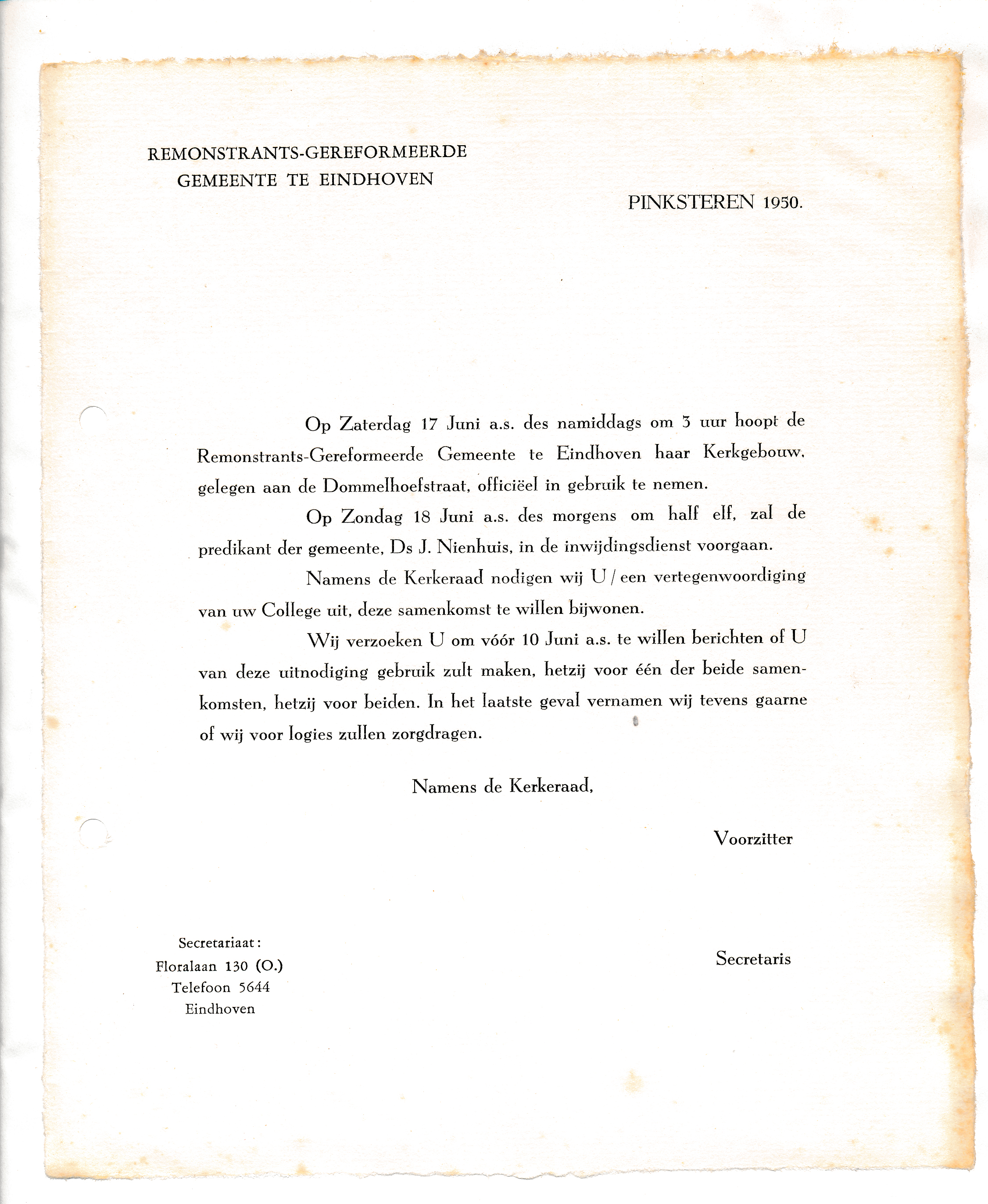 In de Dommelhoefstraat werd op huisnummer 1A in juni 1950 een nieuw kerkgebouw van de remonstrantse kerk geopend. De ingang heeft een zware deur met twee handen en ringen. Zie ook o.a. de foto's #[meer]