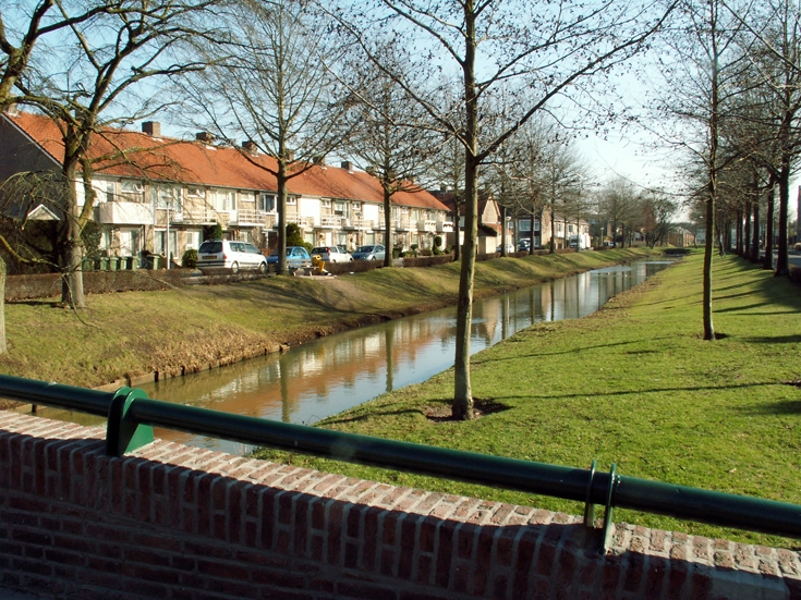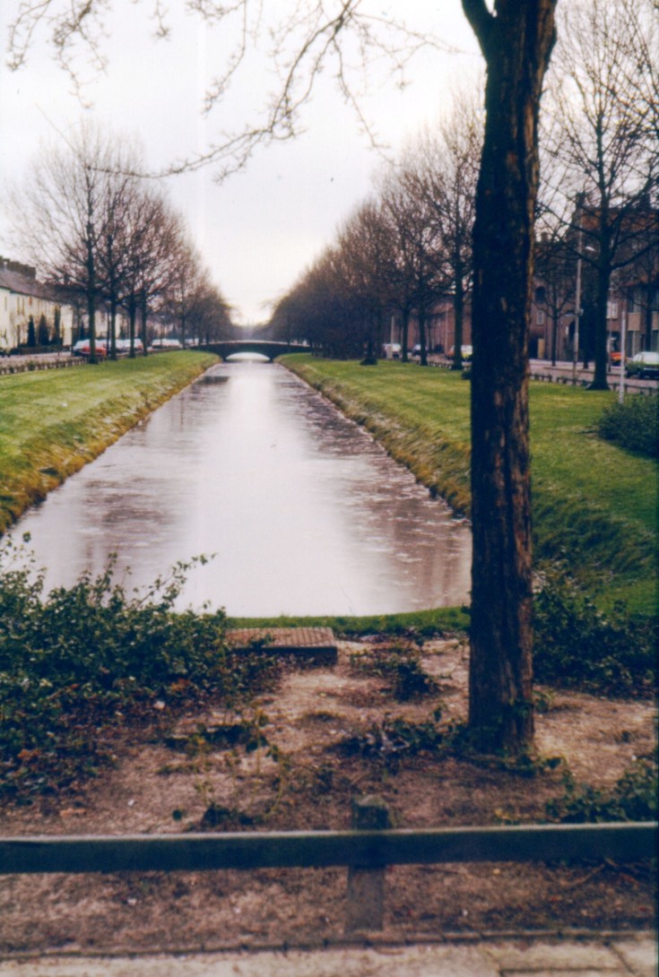 We kijken in de richting van de rondweg, vanaf de brug die halverwege de Jan van Eyckgracht ligt. De flat op de achtergrond ligt aan de Piuslaan. Zie ook foto #55867. (Red.)