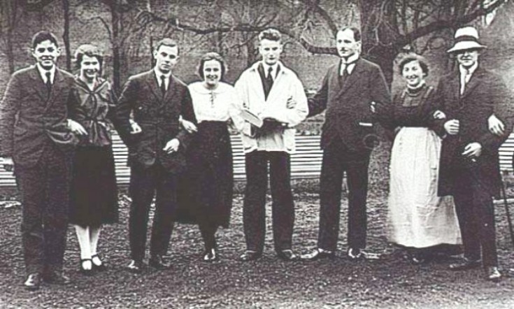 Op de 1ste rij van rechts naar links: Benny Hartog, Frits Philips, Gustaaf ...., 2de rij: Marietje van Poppel, Tini de Jongh, N.N., An von der Nahmer, Roos Hartog, 3de rij: Betsie Lucassen, Piet Groen [meer]