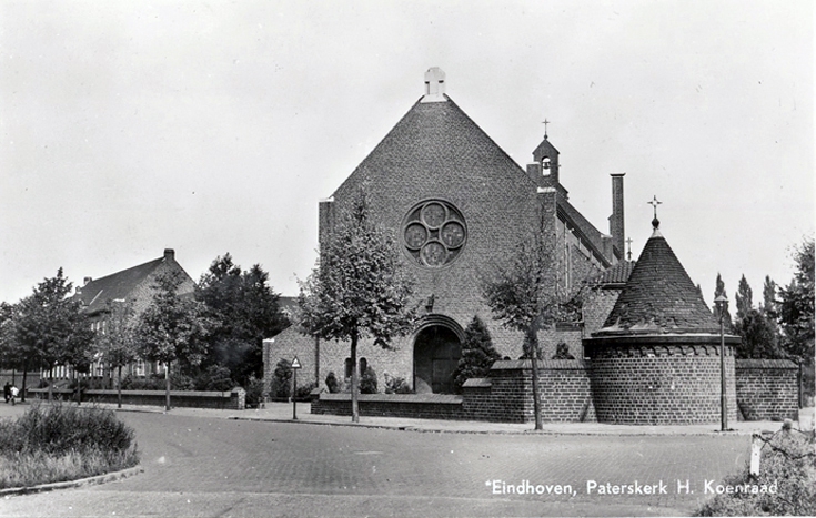 De Koenraadkerk aan de gelijknamige laan die vroeger Bezemstraat heette. Deze prentbriefkaart is een aantal jaren ouder dan foto #201, getuige de bomen, waarschijnlijk begin jaren 1950. De leistenen b [meer]